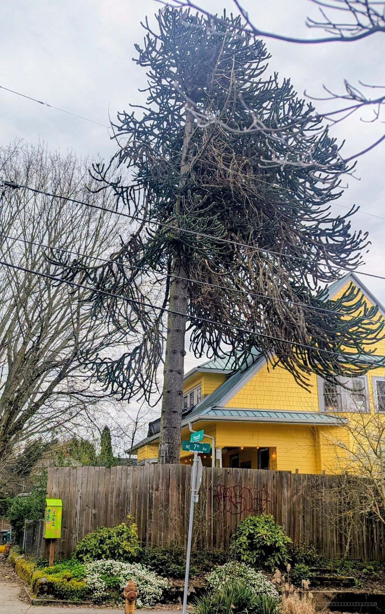 This tree seems rather neglected, maybe carelessly pruned but it looks pretty cute in front of a lively yellow house on a busy street, and I was happy to spot it.