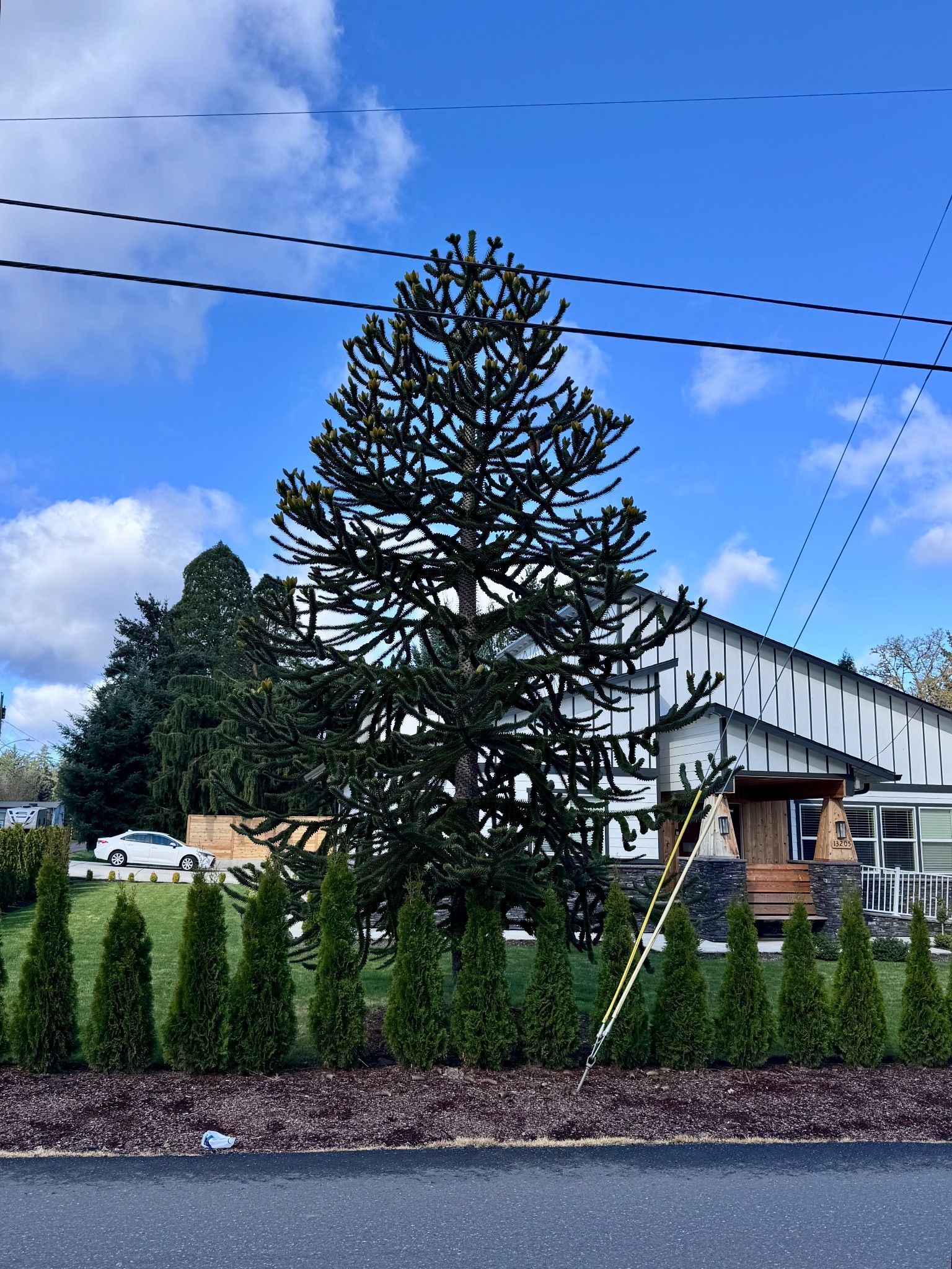 This tree is absolutely beautiful. It’s healthy, green and perfectly visible in the front yard of a home, at a four way stop.